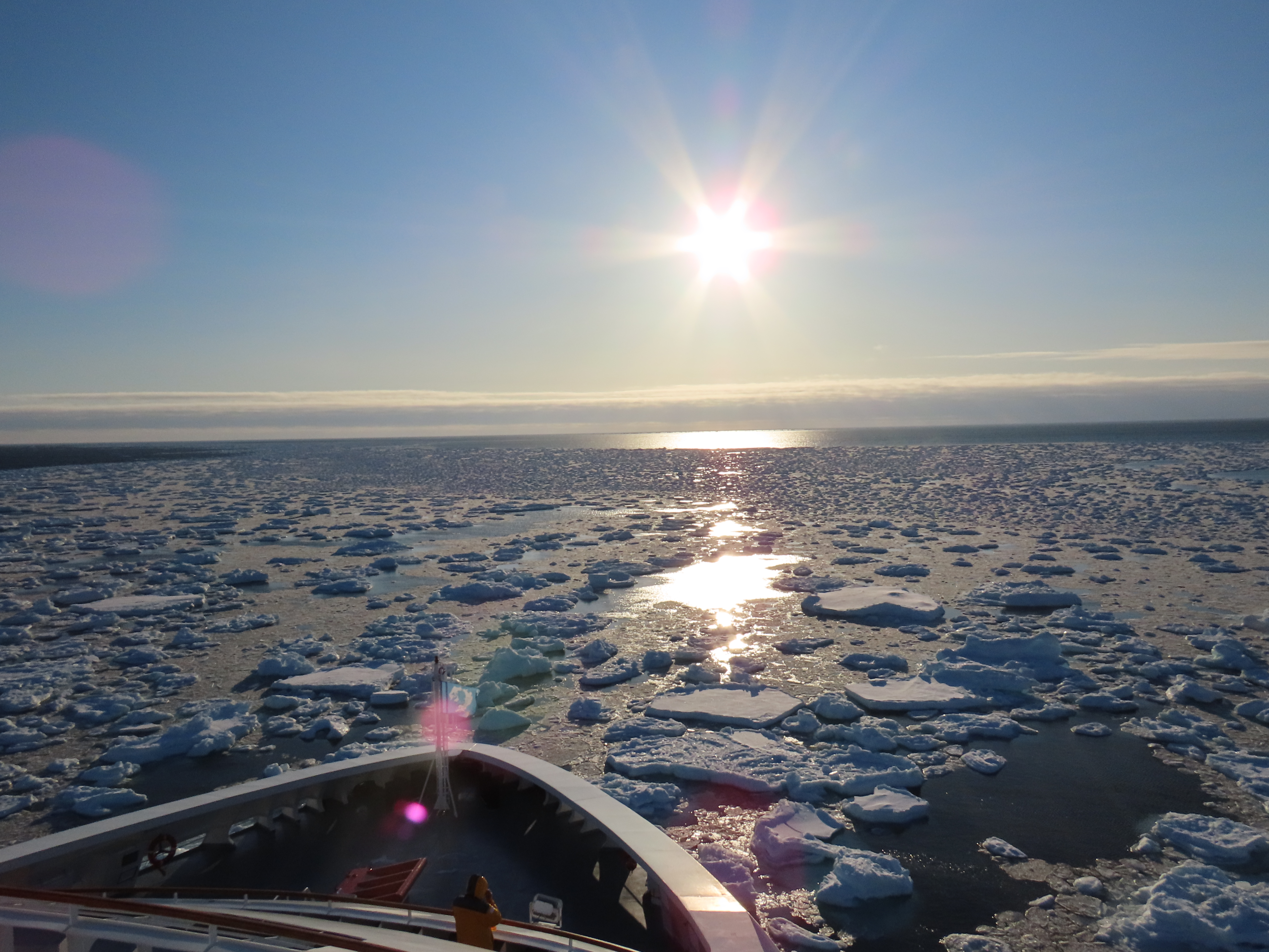 And we sailed north until we hit the Arctic pack ice. Around midnight on May 15, under the bright midnight sun, our ship was the furthest north of any in the world, only 635 miles from the North Pole. It was bitterly cold at 17 degrees with 25 mph winds, but we were jubilant at being at the top of the world, imagining carving through the ice, going straight on till morning.