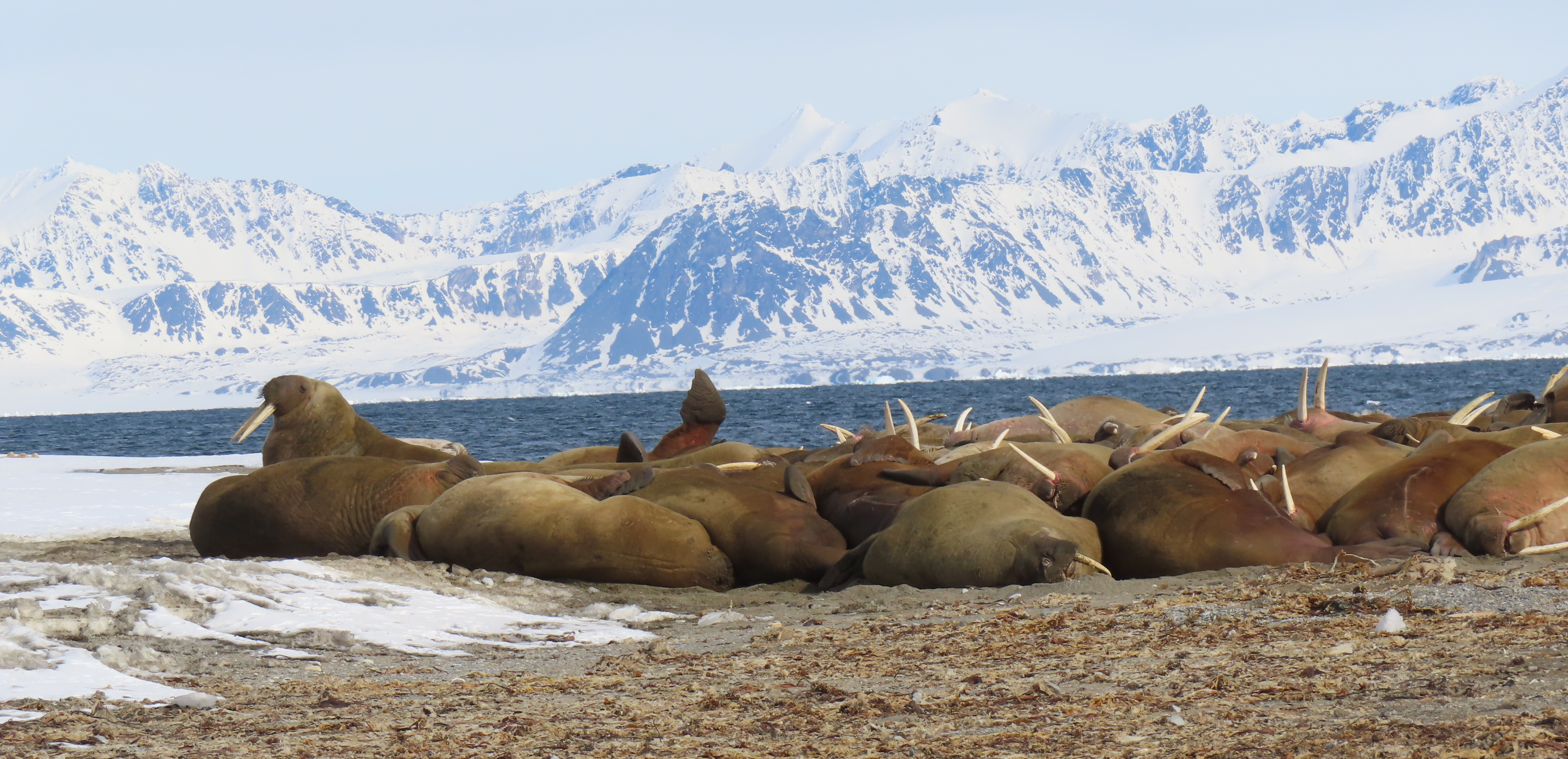 Then we would “pivot” as needed. One day we planned to visit walruses at Moffen Island, but while Ryan and Grigory were scouting in a Zodiac, a large walrus swam out and swung his tusks at them! Luckily the tusks glanced off the rubber raft. Ryan decided it was too risky, and we passed by.